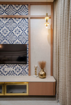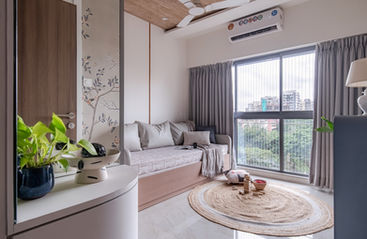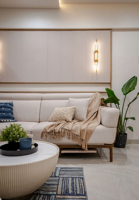The living area is airy and welcoming, featuring clean lines, cozy seating, and carefully curated décor that adds depth without clutter. Gentle lighting and textured wall panels enhance the sense of calm, making it a perfect space to unwind or entertain.
